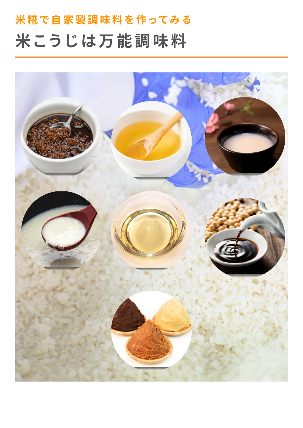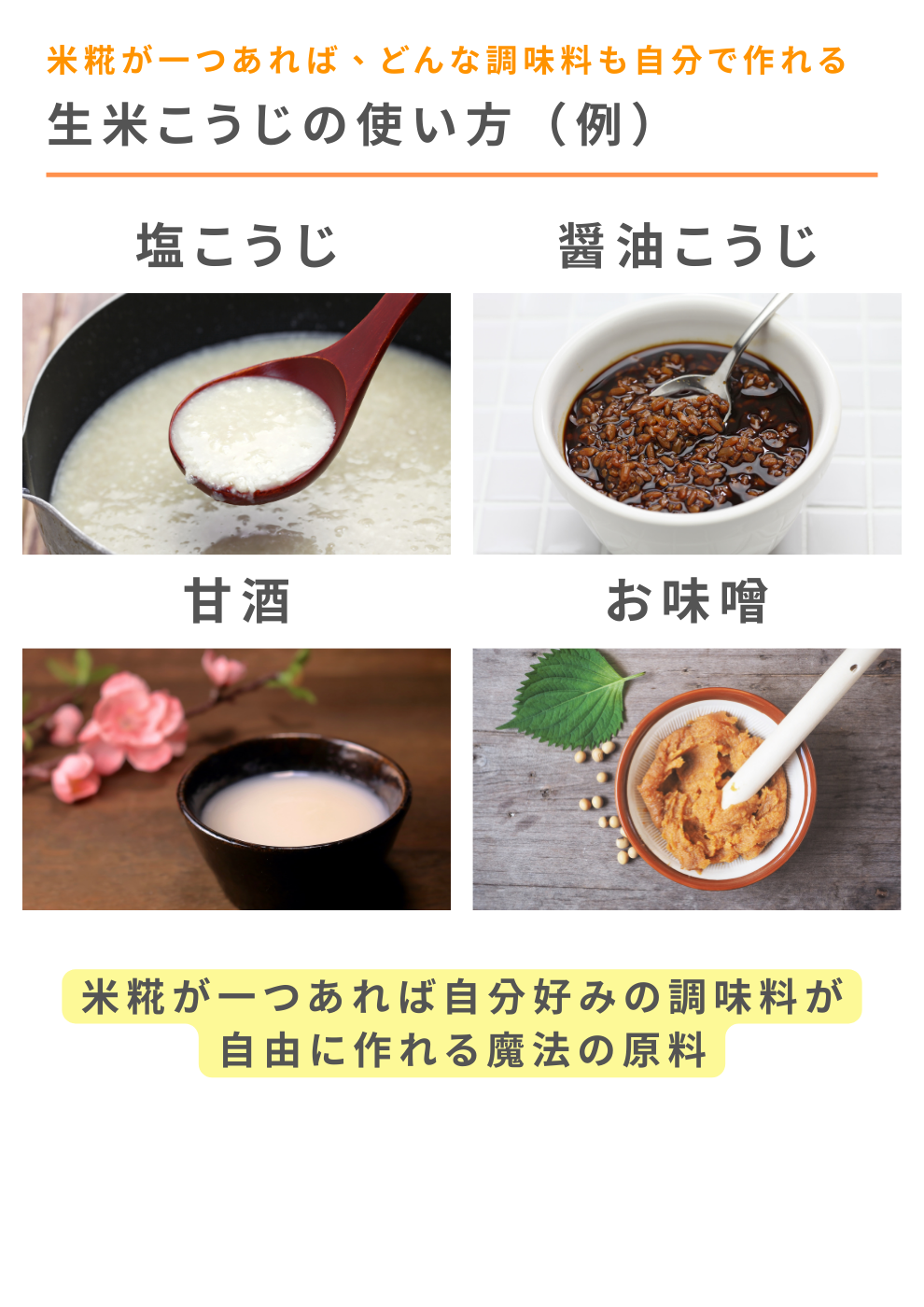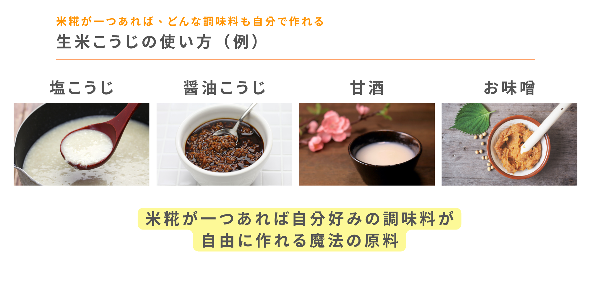 糀を使った自家製調味料を作ることができます。糀調味料があれば、他に調味料を買う必要はありません。