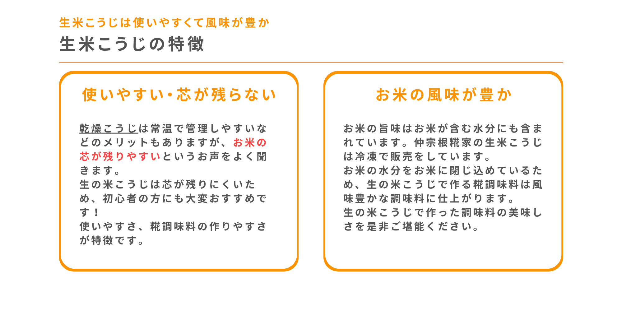 乾燥させていないため、酵素の力(力価)が強く、お米の旨味も閉じ込められた旨味の強い米こうじです。お米の芯が残る心配もありませんので、糀調味料初心者の方にもおすすめです。甘酒を作れば甘みの強い甘酒が作れ、