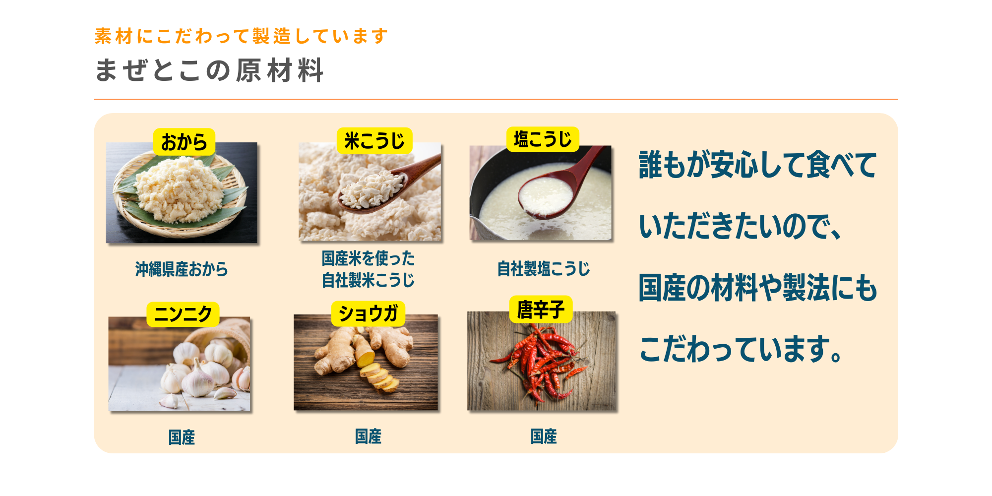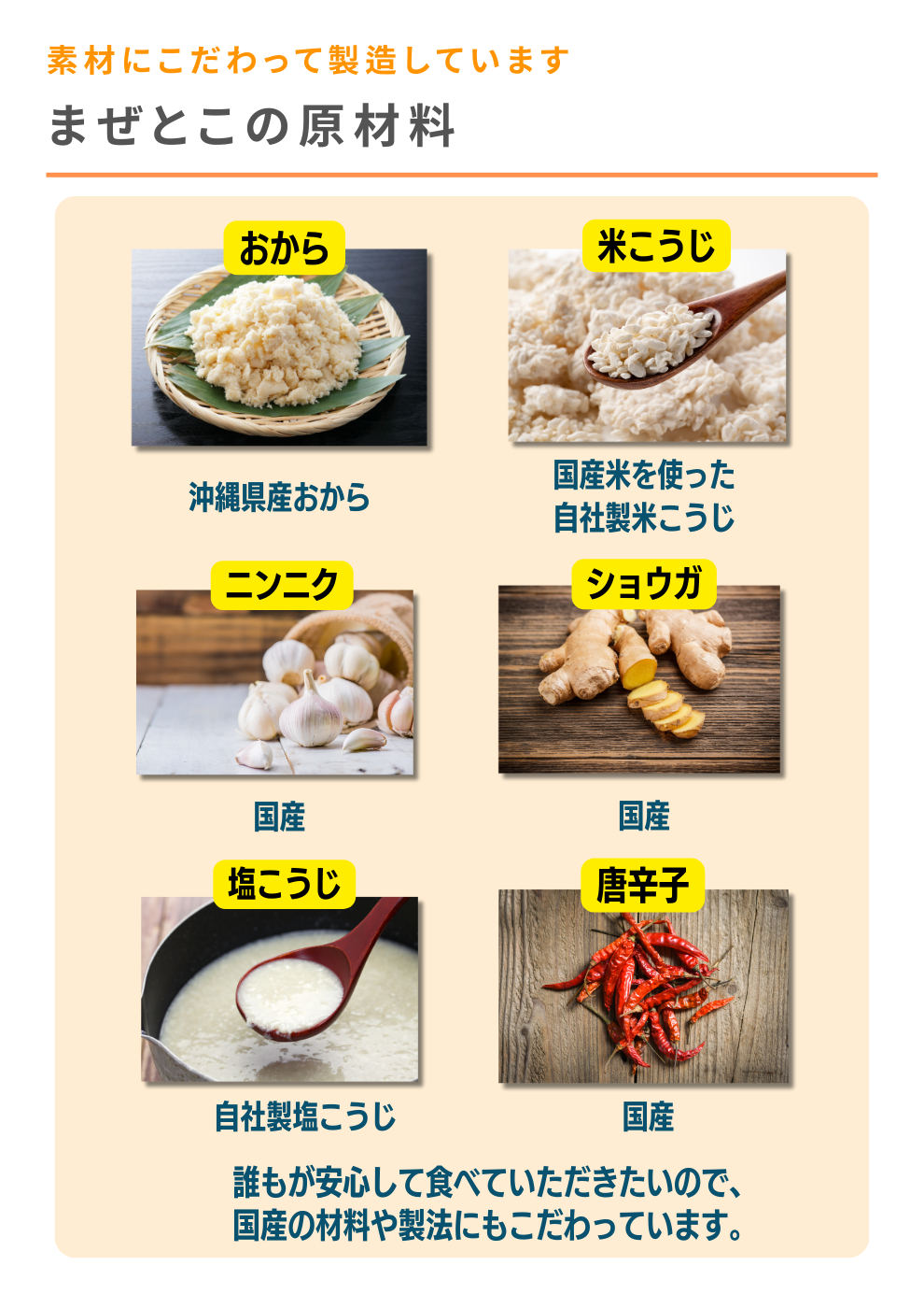 米糀(国産)、おから(遺伝子組み換えなし)、しょうが(国産)、にんにく(国産)、塩(沖縄県産)、唐辛子(韓国産)