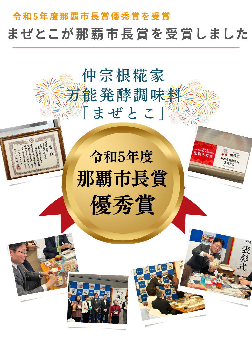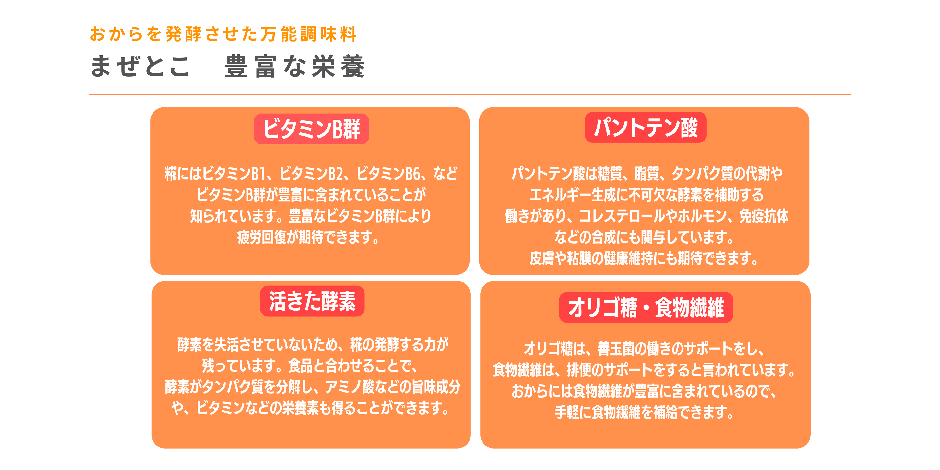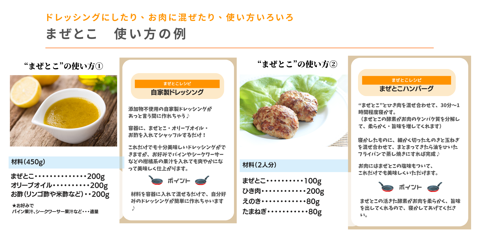 まぜとこはおからを米こうじで発酵させ、塩こうじやニンニク・生姜・唐辛子を混ぜて作った他には無い、仲宗根糀家だけの完全オリジナル「万能調味料」です。令和5年度那覇市長賞にて優秀賞をいただいた商品です。おからと米糀が発酵することで甘みが引き立ち、そこに塩こうじの塩味とニンニク・生姜・唐辛子のアクセントが効いて使い勝手のよい万能調味料に仕上げました。酵素が生きているので、お肉や魚などのタンパク質を柔らかくしてくれます。