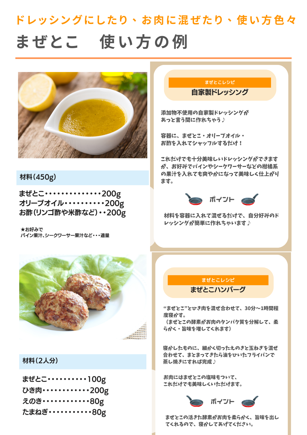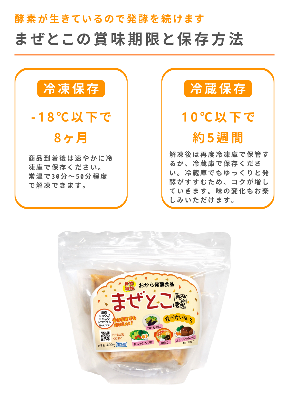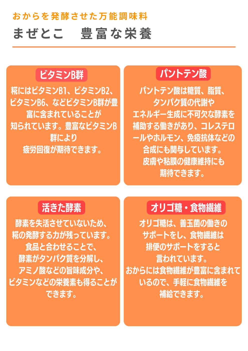 まぜとこはおからを米こうじで発酵させ、塩こうじやニンニク・生姜・唐辛子を混ぜて作った他には無い、仲宗根糀家だけの完全オリジナル「万能調味料」です。令和5年度那覇市長賞にて優秀賞をいただいた商品です。おからと米糀が発酵することで甘みが引き立ち、そこに塩こうじの塩味とニンニク・生姜・唐辛子のアクセントが効いて使い勝手のよい万能調味料に仕上げました。酵素が生きているので、お肉や魚などのタンパク質を柔らかくしてくれます。