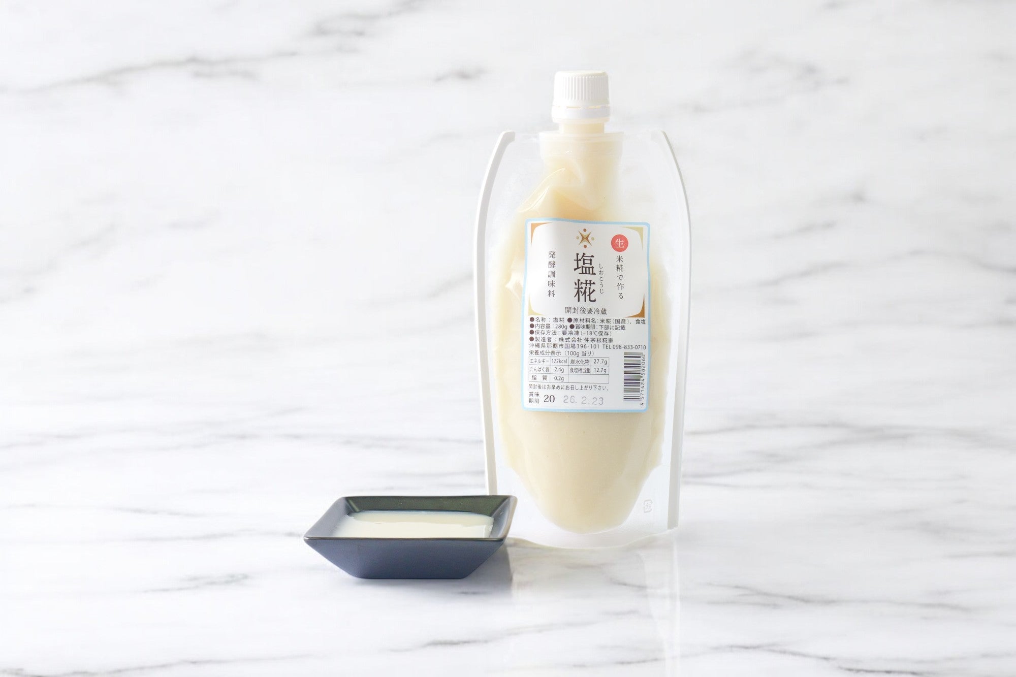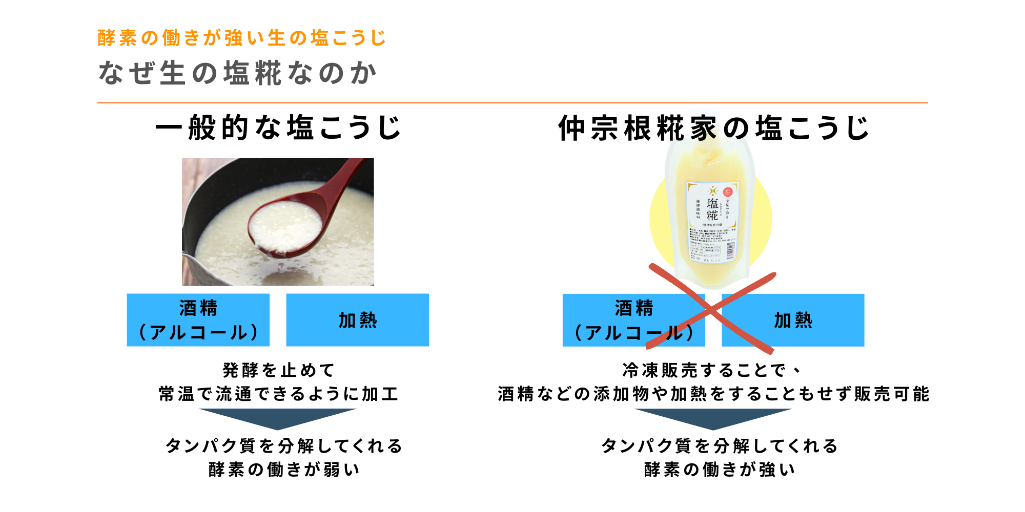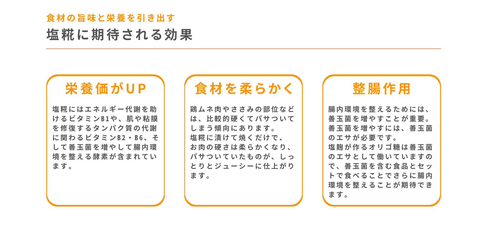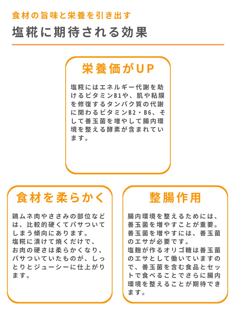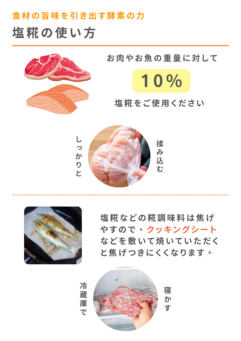生の塩こうじなので、生きた酵素がお肉や魚にじっくり漬け込んでタンパク質を分解し、旨味成分であるアミノ酸に変換してくれます。